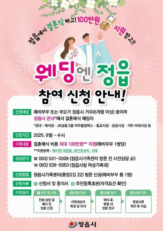 ‘웨딩엔 정읍’은 정읍에서 결혼식을 올리는 신혼부부에게 최대 100만원의 예식 비용을 지원하는 신규 시책으로, 생활인구 유입과 지역경제 활성화를 도모하기 위한 취지로 마련됐다.