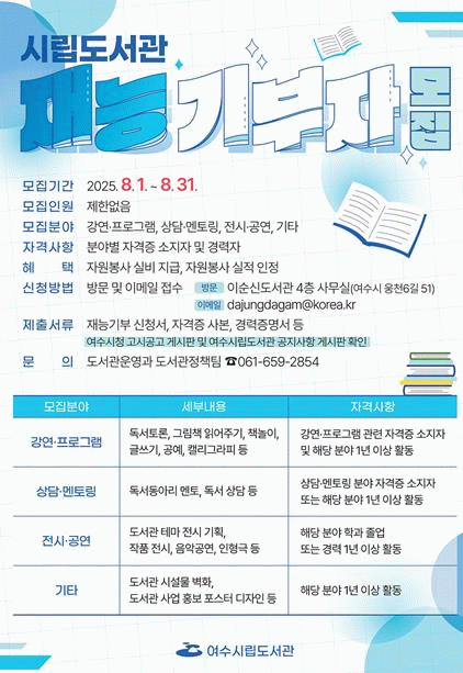 신청 기간은 8월 1일부터 8월 31일까지이며, 신청 희망자는 여수시청 누리집 ‘고시공고’ 또는 여수시립도서관 누리집 ‘공지사항’에서 신청 서식을 내려받아 작성 후, 서류를 방문(이순신도서관 4층 사무실) 또는 이메일로 제출하면 된다.