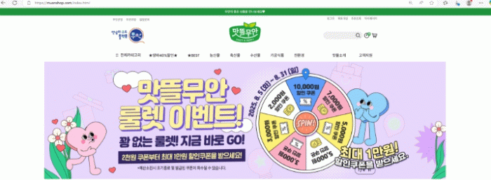 프로모션 기간은 8월 5일부터 31일까지로 ‘꽝 없는 룰렛이벤트’는 ’맛뜰무안몰‘ 회원이라면 누구나 참여할 수 있으며, 룰렛을 돌려 최소 2,000원부터 최대 10,000원까지의 할인쿠폰을 무작위로 제공한다.