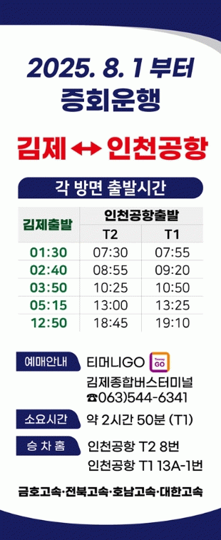 인천공항 고속버스 증편 노선은 김제종합버스터미널에서 오전 1시 30분 첫차를 시작으로 오후 12시 50분까지 하루 5회 운행하며, 약 2시간 50분 소요된다.