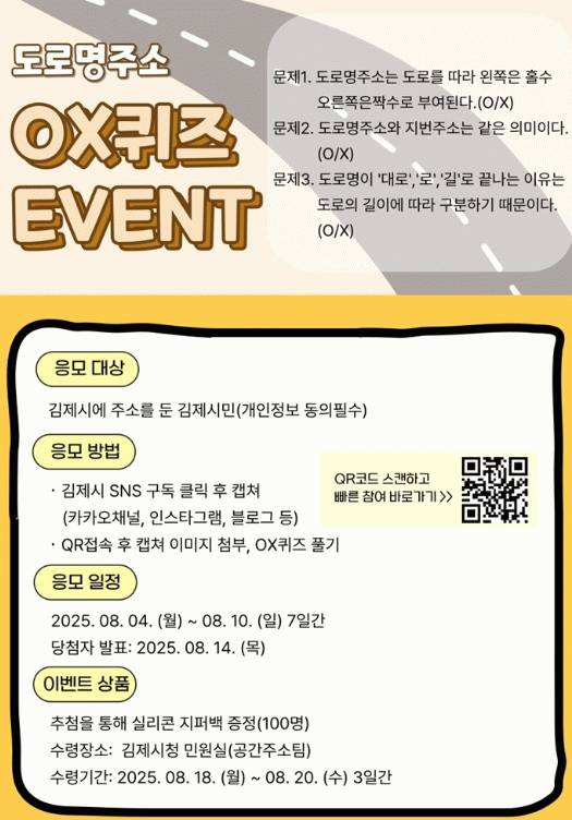 김제시에 주소를 둔 시민이라면 누구나 참여할 수 있으며, 이번 이벤트는 인스타그램, 카카오채널 등 김제시 SNS에 게시된 내용을 참고해 QR인증 후 서식 작성 및 제출하면 된다.