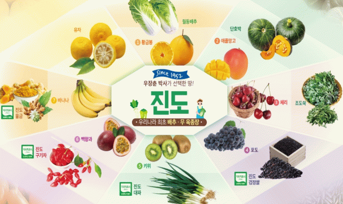 특히, 농림축산식품부에서 인증하는 지리적표시 4대 우수 농산물인 진도검정쌀, 진도대파, 진도구기자, 진도울금과 조도쑥, 월동배추, 유자, 단호박 등 총 15개 품목을 담았다.