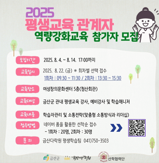 금산다락원 관계자는 “지속적인 역량 강화교육을 통해 평생교육 관계자의 실무 능력 향상을 도울 것”이라며 “사례 중심 학습으로 현장 대응력을 높일 수 있도록 최선을 다하겠다”고 말했다.