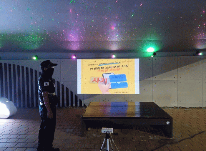 전남 기동순찰대는 무더위를 피해 지역민들이 야간에 주로 이동하는 장소를 찾아 △기초질서 △외국인범죄예방 △다중피해사기 등 빔 프로젝터를 활용해 홍보효과를 극대화 했다.