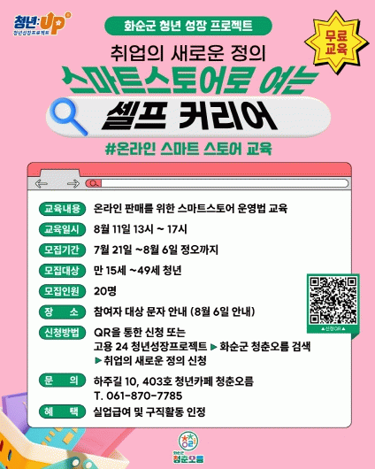 모집인원은 20명이며, 화순군에 거주하는 만 15세 ~49세 청년이라면 누구나 무료로 참여할 수 있다. 8월 6일 12시까지 QR 또는 고용24를 통해 선착순으로 모집한다.