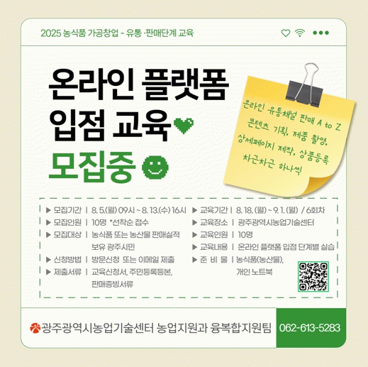 모집 대상은 농식품 또는 농산물의 온·오프라인 판매 실적이 있는 광주시민으로 선착순 10명을 모집한다. 신청은 오는 4일 오전 9시부터 13일 오후 4시까지이며, 농업기술센터 농업지원과(1층)를 방문하거나 전자우편으로 접수하면 된다.