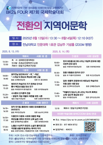 전남대학교 BK21 FOUR 지역어문학 기반 창의융합 미래인재 양성 교육연구단은 오는 8월 13일부터 14일까지 양일간 제7회 국제학술대회를 전남대학교 인문대학 1호관 김남주 기념홀에서 개최하며, 온라인 비대면 학술대회(ZOOOM, 회의 ID: 81748548732, 암호: 404312)도 병행한다.