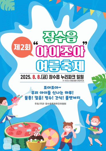 한동근 축제추진위원장은 “작년에 이어 올해도 아이들의 웃음소리가 울려 퍼지는 장수읍을 만들고자 축제를 준비했다”며 “아이와 가족 모두가 만족할 수 있도록 알차게 구성한 만큼 많은 참여를 부탁드린다”고 말했다.