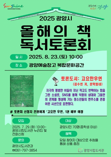 행사는 중학생 이상 광양시민 누구나 참여할 수 있으며, 7월 29일부터 광양시립도서관 누리집 또는 전화 신청을 통해 접수할 수 있다. 자세한 사항은 도서관 누리집을 확인하거나 도서관지원팀에 문의하면 된다.