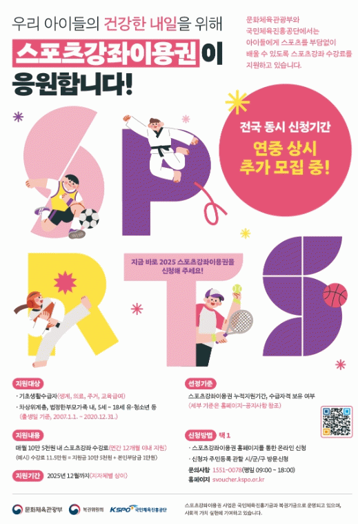 스포츠강좌이용권은 만 5세부터 만 18세 이하(2007년 1월 1일~2020년 12월 31일)의 기초생활수급자(생계·의료·주거·교육급여), 차상위계층, 법정 한부모가정 등의 청소년을 대상으로 매월 105,000원 한도 내에서 체육강좌 수강료를 지원하는 사업이다.