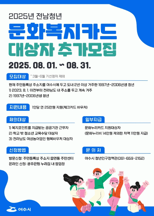 여수시는 올해 상반기 16,649명의 청년을 대상자로 선정했으며, 이번 추가 모집을 통해 상반기에 신청하지 못한 청년 2,203명을 추가로 선정할 계획이다.