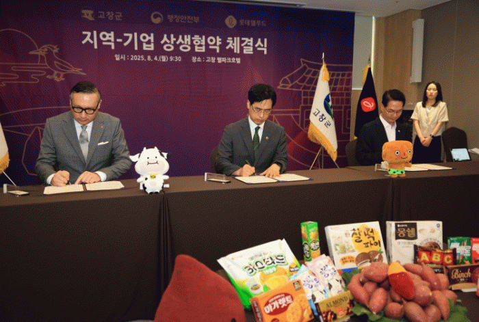고창군이 4일 오전 고창군 웰파크호텔에서 행정안전부, 롯데웰푸드와 ‘지역 상생발전을 위한 업무협약’을 체결했다. 협약식은 심덕섭 고창군수, 김민재 행정안전부 차관, 배성우 롯데웰푸드 마케팅본부장을 비롯한 실무 관계자들이 참석한 가운데 진행됐다.