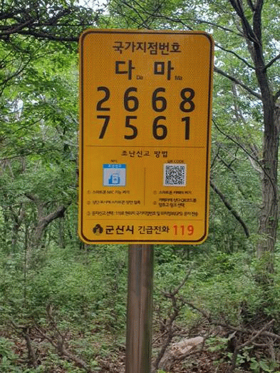 국가지점번호는 건물이 없는 산악, 해안 등 비거주지역에 누구나 쉽게 위치를 찾도록 설치하는 위치 표시 체계이며, 한글 2자리와 숫자 8자리를 조합한 10자리 번호로 구성되어 있다.