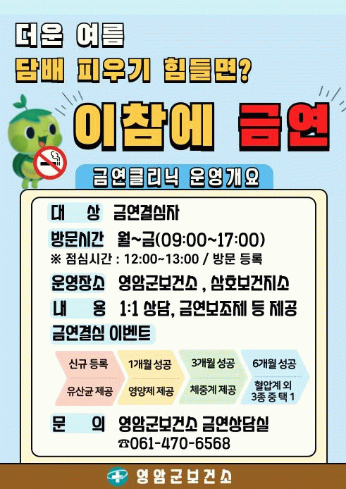 영암군보건소와 삼호보건지소에서 상시 운영되는 금연클리닉에서는 ▲1:1 상담 ▲니코틴 패치 등 금연보조제 지급 ▲은단 등 행동강화물품 제공 등이 이뤄진다.