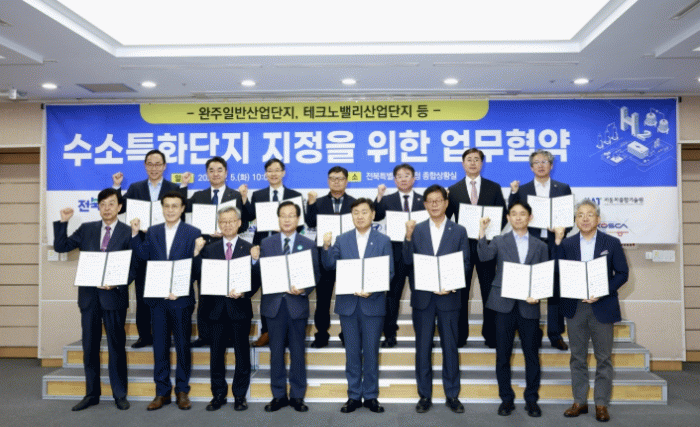 5일 완주군 전북도청 종합상황실에서 ‘전북 완주 수소특화단지 지정·육성을 위한 업무협약’을 체결하고, 산업통상자원부의 수소특화단지 지정 공모에 공동 대응하기 위한 협력체계 구축에 뜻을 모았다.
