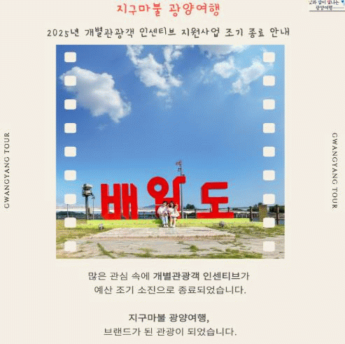 시는 2025년 개별관광객 인센티브 지원사업에 서울, 부산 등 전국 각지에서 총 148팀, 470명이 참여해 광양관광을 경험했으며, 이를 통해 유·무형의 브랜드 가치를 높인 것으로 자체 평가했다.