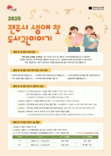 ‘생애 첫 도서관 이야기’ 하반기 프로그램 참여를 원하는 가정은 전주시 도서관 누리집에서 온라인으로 신청하거나, 각 도서관별로 전화 및 방문 접수를 통해 가능하다.