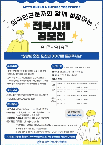 전북국제협력진흥원 관계자는 “우리 산업현장은 도민과 외국인근로자의 땀과 열정으로 함께 성장해왔다.”라며, “이번 공모전을 통해 내·외국인 모두가 안전하고, 차별없이 일하는 전북을 만드는 밑거름이 되기를 기대한다”라고 밝혔다.