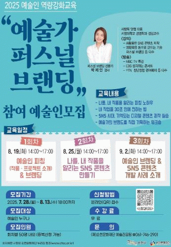 교육일정은 8월 19일 예술인 피칭(작품·프로젝트 소개)&브랜딩 교육을 시작으로 8월 25일 나를, 내 작품을 알리는 SNS 콘텐츠 만들기 그리고 9월 2일 예술인 브랜딩 & SNS 콘텐츠 개발 사례 소개 등으로 진행된다.