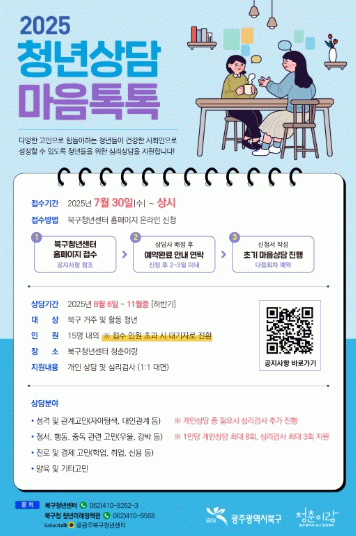 ‘청년상담 마음톡톡’은 진로, 대인관계, 정서 불안 등 다양한 고민으로 어려움을 겪는 청년들에게 전문적인 심리상담 서비스를 제공해 마음을 치유할 수 있도록 돕기 위한 맞춤형 상담 프로그램이다.