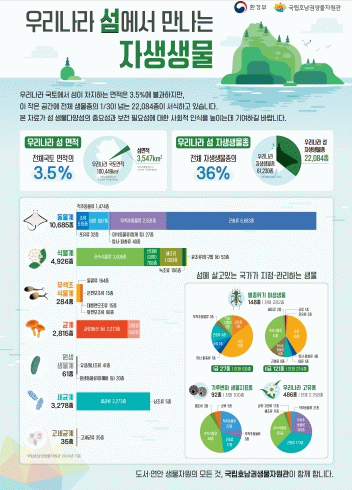 현재 우리나라 섬 면적은 3,547km2로 국토의 약 3.5%에 불과하지만, 이 공간에 서식하는 생물은 전체 자생생물 61,230종 중 36%를 차지해, 섬이 생물다양성의 보고이자 핵심 연구 대상지임을 보여준다.