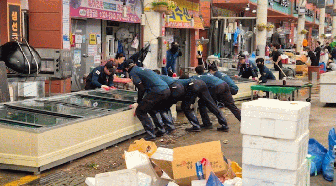 이번 수해 복구 지원 활동은 2개 중대 총 115명이 투입되어 침수된 전통시장 내·외부 집기류 정리 및 대동면 일대 비닐하우스 정비 등 수해 복구에 힘을 보탰다.