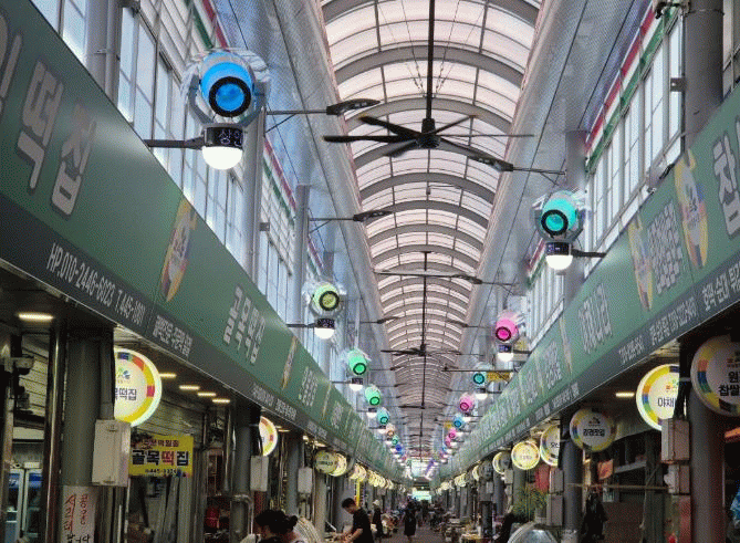 쿨링포그와 함께 설치된 HVLS팬도 넓은 면적에 고르게 바람을 보내 시장의 실내외 공기 순환을 도와줘 무더위를 효과적으로 완화한다.