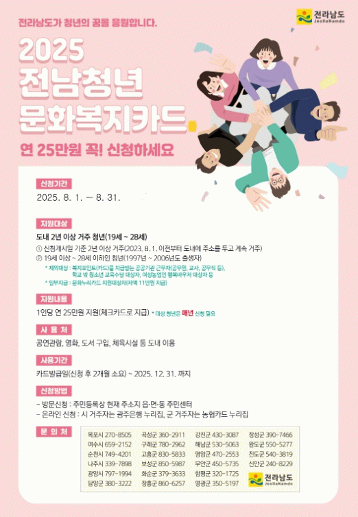 윤연화 전남도 인구청년이민국장은 “전남청년 문화복지카드 사업이 청년의 문화·여가 활동을 활성화하고 지역 문화산업에도 긍정적 영향을 주고 있다”며 “지역 청년의 문화 활동 격차 해소를 위해 많은 신청 바란다”고 말했다.
