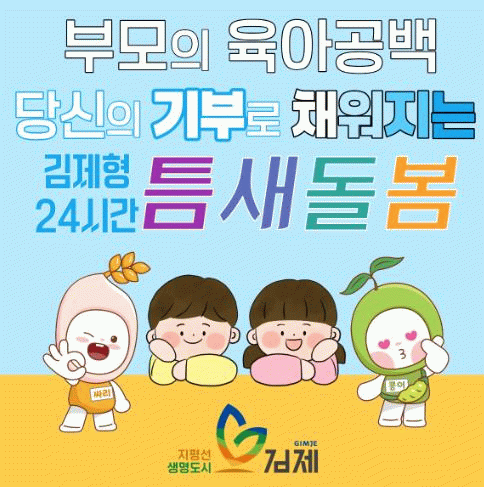 한편, 지정기부사업은 고향사랑e음에 접속해 특정사업에 기부하기를 선택하고 전북특별자치도 김제시의 ‘부모의 육아공백 당신의 기부로 채워지는 김제형 24시간 틈새돌봄’이라 적힌 이미지의 사업을 선택하거나 ‘김제 365일 24시간 아이돌봄센터 운영’을 검색하여 사업에 기부할 수 있다.