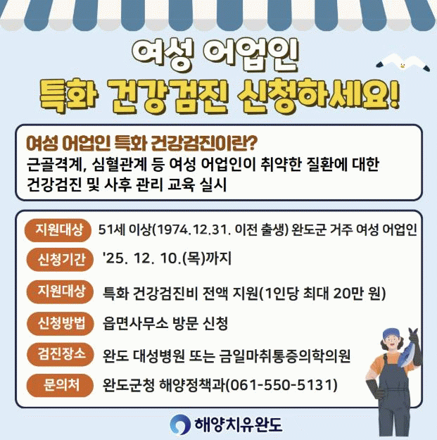 검진을 희망하는 여성 어업인은 12월 10일까지 주소지 관할 읍면사무소에 신청하면 대성병원 또는 금일마취통증의학의원에서 검진을 받을 수 있다.
