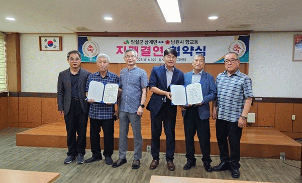 삼계면사무소에서 진행된 자매결연 협약식에는 한경문 삼계면장과 최현목 향교동장을 비롯한 양 지역 사회단체장들이 자리했다.