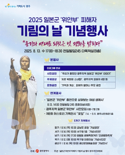 광주광역시가 일본군 위안부 지역 피해 사례를 최초로 발굴‧공개하고, 이를 바탕으로 시민 참여형 기념행사인 ‘일본군 위안부 피해자 기림의 날’을 오는 13일 오후 5시 전일빌딩245 다목적강당에서 개최한다.