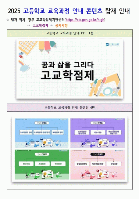 시교육청은 8일 광주 고교학점제지원센터 누리집에 고등학교 교육과정 안내 콘텐츠 ‘쉽게 알려주는 고(고교학점제)! 고(등학교 교육과정)!’을 탑재한다.