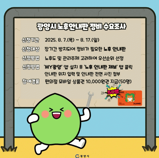 제보 방법은 간단하다. 광양시 모바일 통합행정플랫폼 ‘MY광양’ 앱을 설치하고 ‘노후 안내판 제보’ 탭에 접속, 노후 안내판의 전면 사진을 첨부하고 정확한 위치를 기재하면 된다. 제보자 50명에게는 추첨을 통해 편의점 모바일 상품권 10,000원권이 지급된다.