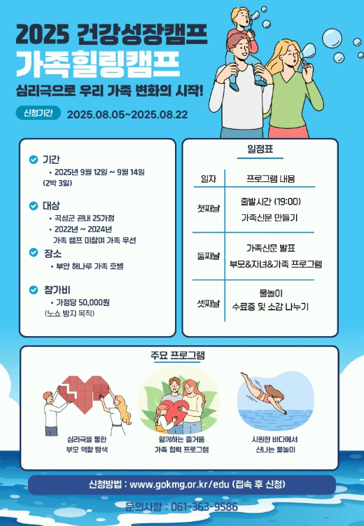 모집 대상은 곡성군 내 청소년 자녀를 둔 25가정이며, 2022년부터 2024년까지 가족캠프에 참여하지 않은 가정이 우선 선정된다.