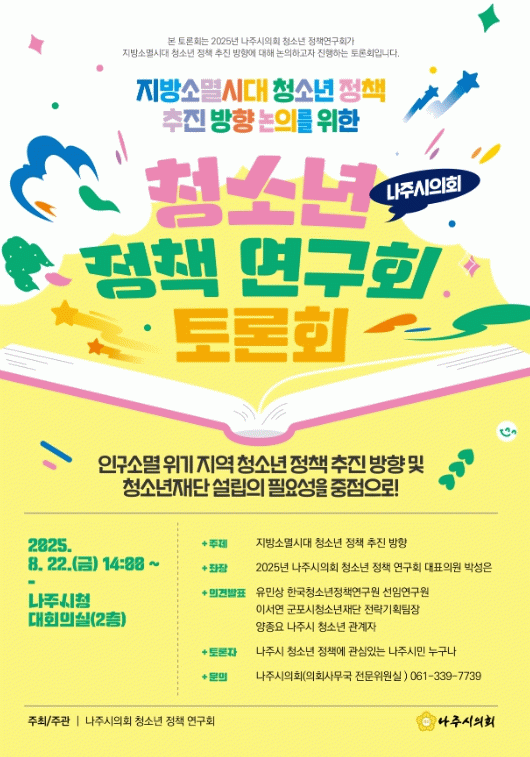 특히 지방소멸 위기 속에서 청소년 정책의 새로운 방향을 제시하고, 군포시 청소년재단의 우수 프로그램 사례를 통해 다양한 정책 모델을 공유하는 한편, 나주에 적합한 청소년 정책 전담 조직의 필요성에 대해서도 논의할 계획이다.
