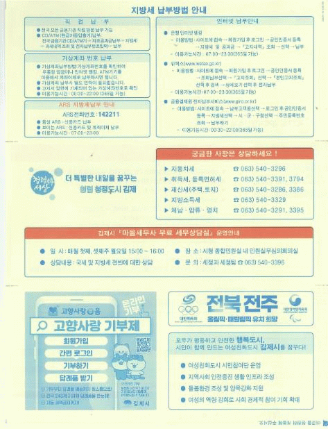 우선 가장 많은 납세자가 납부하는 주민세부터 세금 고지서에 청렴 메시지를 담아 행정에 대한 신뢰를 높이고, 건전한 납세 문화를 조성하겠다는 취지로 “더 특별한 내일을 꿈구는 청렴 청정도시 김제” 라는 문구가 삽입되며, 납세자가 쉽게 확인할 수 있도록 고지서 중앙에 배치된다.