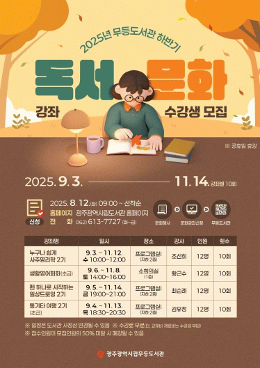 강좌 수강을 희망하는 시민은 오는 8월 12일(화)부터 광주시립도서관 누리집 ‘문화강좌신청’을 통해 접수하면 된다.