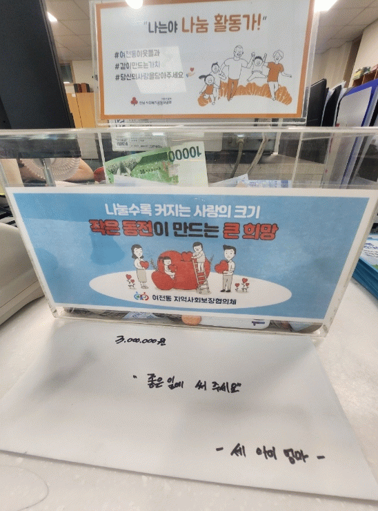 A씨는 “과거 자신과 자녀가 잦은 병치레로 힘든 시간을 보냈지만, 최근 모두 건강을 회복하면서 병원비 부담이 줄었다”며 “7살 자녀와 함께 ‘아껴진 병원비로 좋은 일을 하자’고 약속해 기부를 하게 됐다”고 밝혔다.