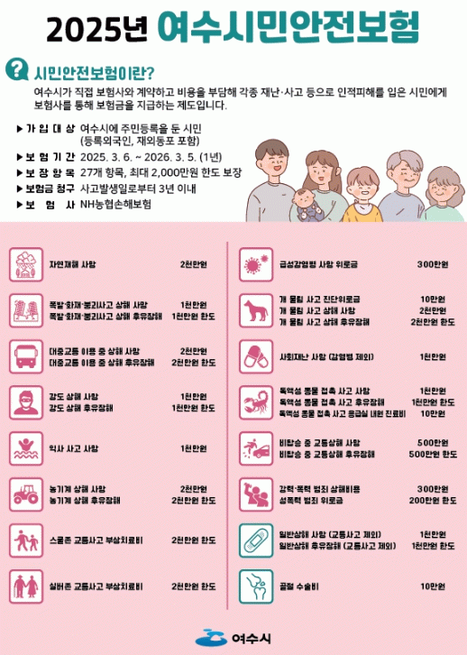‘시민안전보험’은 별도의 절차 없이 여수시민 전체가 자동 가입되며, 각종 사고나 재난 발생 시 실질적인 보장을 제공한다.