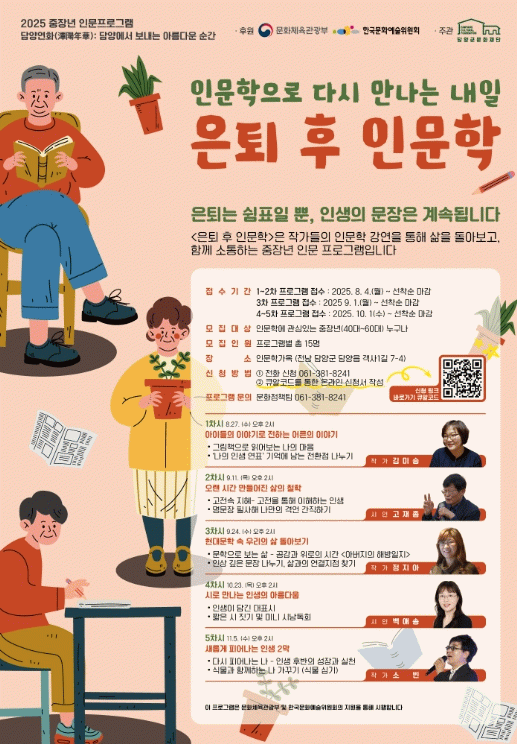 ‘은퇴 후 인문학’은 동화, 고전, 소설, 시 등 다양한 문학 장르를 중심으로 삶 전반을 다룬 다섯 가지 주제에 관해 작가들의 강의와 체험이 진행되는 참여형 인문 강좌로, 광주·전남 등 폭넓게 활동하는 작가들의 전문 강의와 더불어 자신의 경험과 감정을 자유롭게 이야기하며 함께 성장하고 위로를 나누는 시간을 갖는다.