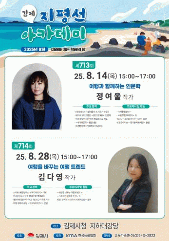 김제시는 '지평선 너머, 마음을 움직이는 여행 이야기'라는 테마 아래, 오는 14일 정여울 작가, 28일 김다영 작가를 초청해 시청 대강당에서 15시부터 강연을 진행한다.