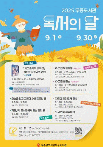 무등도서관은 9월 1일부터 어반드로잉, 민화 작품 갤러리 전시와 자료실 테마도서 전시를 시작으로 ▲9월 6·13일 K-고전 특강(초등학생 대상) ▲9월26일 허진희 작가 강연 ‘만약에 놀이로 시작하는 열린 상상’ 등 7개 프로그램을 준비했다.