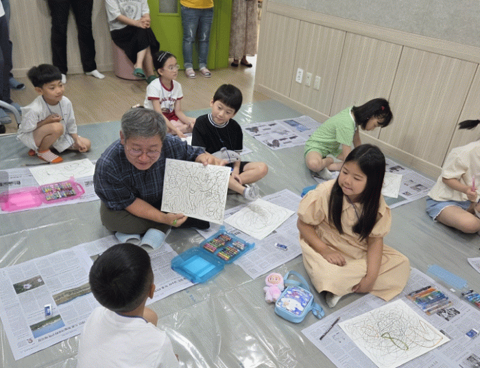 정승각 화백은 ‘강아지똥’, ‘오소리네 집 꽃밭’의 그림작가로 유명하며 지역 내 초교생 20여 명을 대상으로 프로그램을 진행했다.
