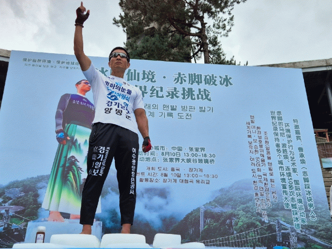 그는 8월 10일, 한중문화교류국제미디어와 중국세계일대일로 공소연맹 문화부 초청으로 열린 행사에서 ‘얼음 위 맨발 오래 서 있기’ 5시간 20분을 기록해 세계신기록을 세웠다.