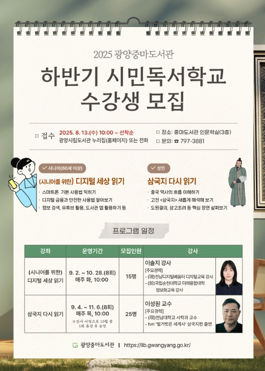 이번 사업은 광양시민의 문해력과 독서력 향상을 위해 마련됐으며, ▲시니어를 위한 디지털 세상 읽기 ▲삼국지 다시 읽기 2개 강좌로 진행된다.