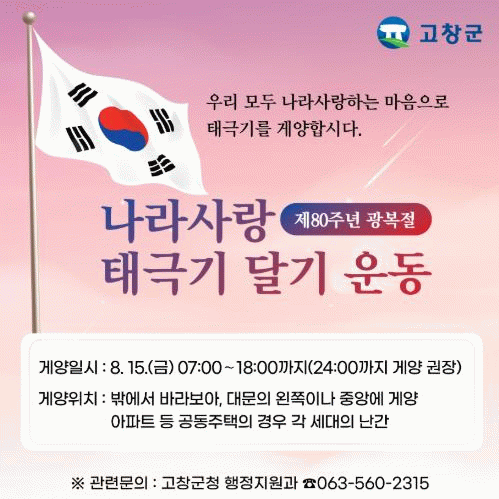 심덕섭 고창군수는 “제80주년 광복절은 선열들의 희생과 헌신을 되새기고 나라사랑을 실천하는 뜻깊은 날”이라며 “군민 모두가 자발적으로 태극기를 게양해 광복의 감격과 의미를 나누길 바란다”고 말했다.