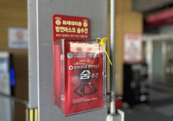 이번에 설치된 ‘숨수건’은 주차장 비상구 계단 등 눈에 띄는 곳에 비치됐으며, 포장지 외부에는 그림과 함께 사용법이 안내돼 있어 비상 상황에서 직관적으로 활용할 수 있도록 구성돼 있다.
