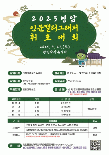 노재영 영암군 인재육성체육과장은 “전통 서예의 품격과 캘리그래피의 감성으로 인문 정신을 되새기는 뜻깊은 대회에 많은 참가 바란다. 영암 왕인박사유적지에서 함께 멋있는 작품을 나누면 좋겠다”고 전했다.