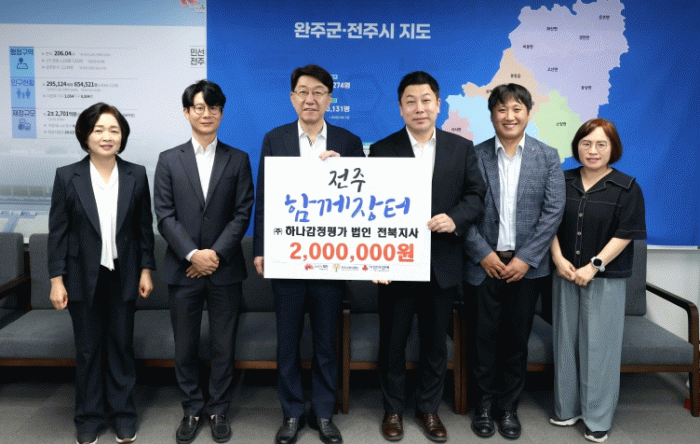 ㈜하나감정평가법인 전북지사(대표 김창배)는 12일 전주시장실을 방문해 ‘전주함께장터’ 운영 기부금 200만 원을 전달했다.